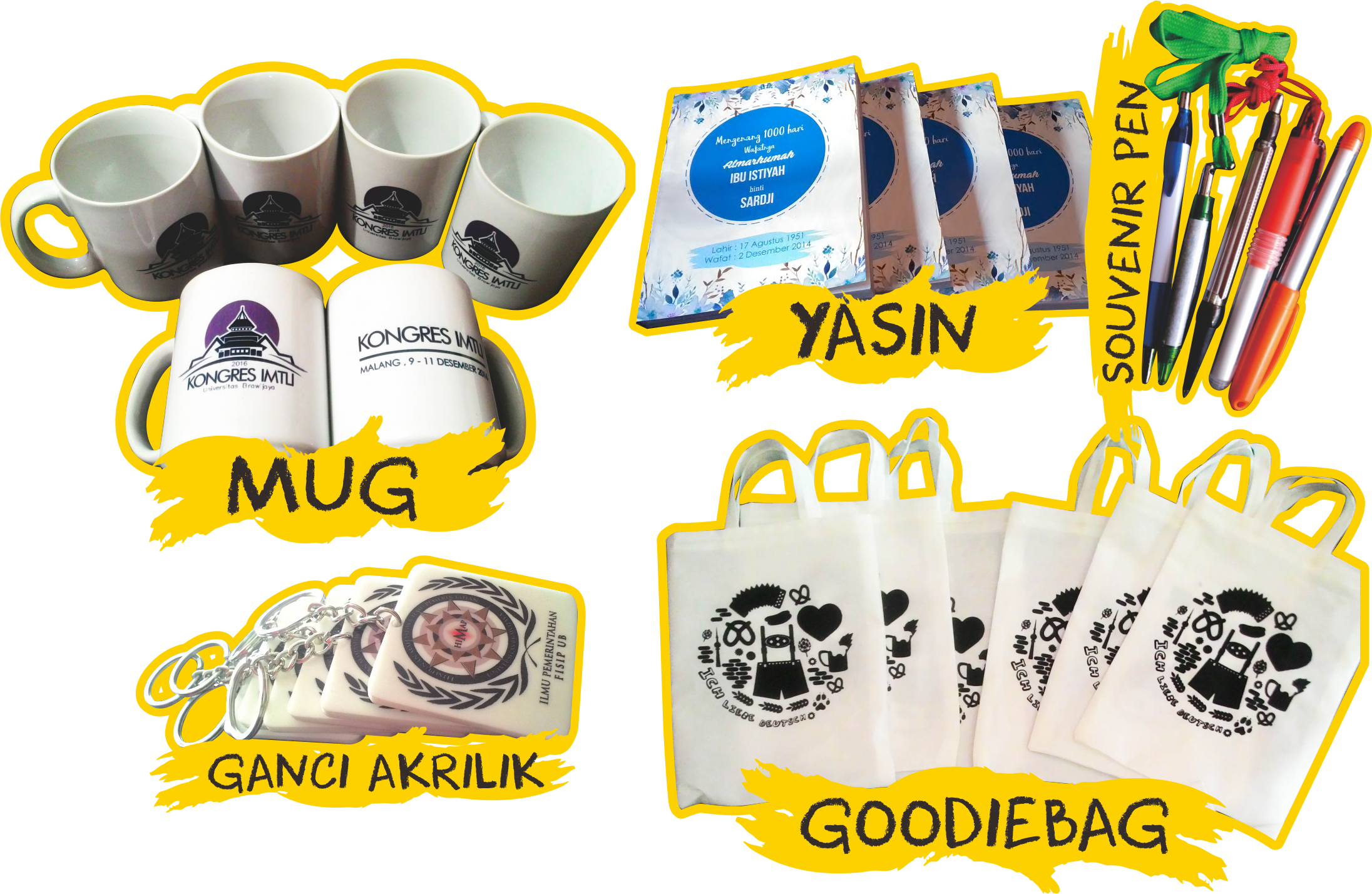 Kami menerima jasa pembuatan berbagai macam souvenir yang bisa dijadikan pelengkap acara anda seperti, Pernikahan, Rapat, Seminar, Gathering, School Event atau acara lainnya. Beberapa contoh souvenir yang kami buat yaitu: Gantungan Kunci (Keychain), Pin, Blocknote, Pulpen, Name Tag, Nama Dada, Mug, Sablon Tali ID Card, Stampel Kayu (Runaflek) Paper Bag, Kipas, Plakat/Vandel, Kalender, Gantungan Kunci Akrilik, Buku Yasin, Sablon Map Plastik, aneka souvenir pernikahan.